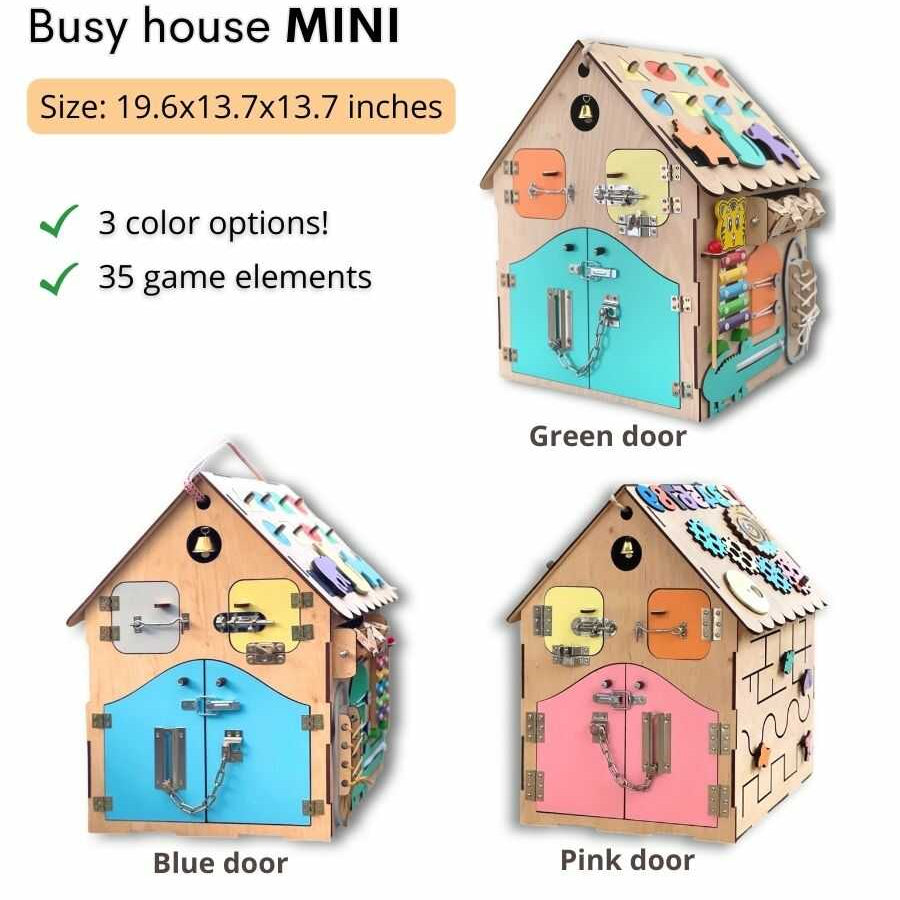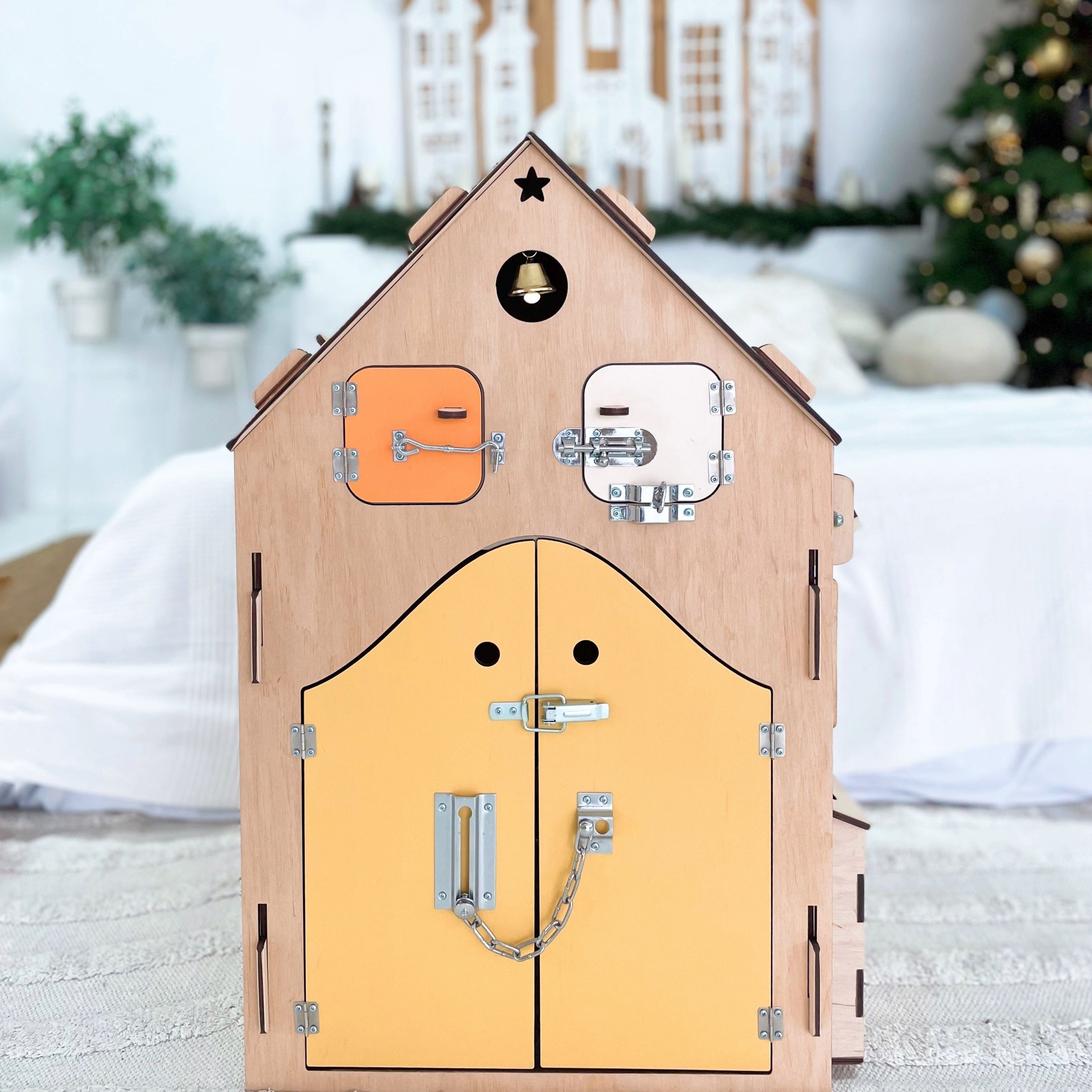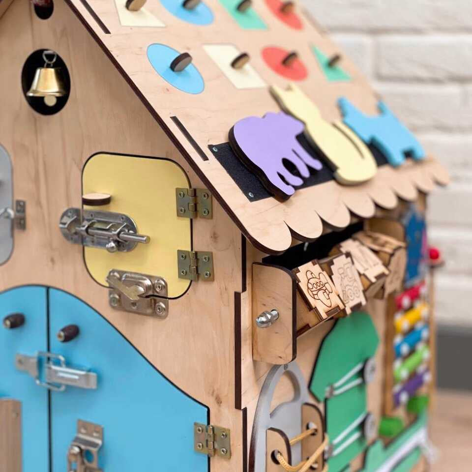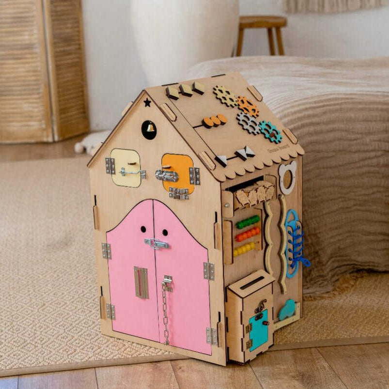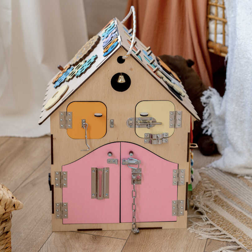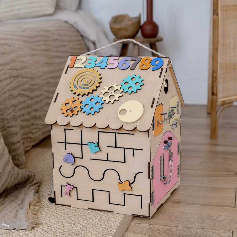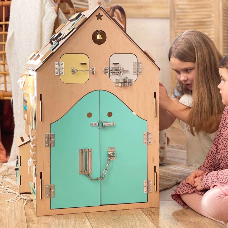 The busy house is designed to strengthen children's fine motor development. Children can play together with this toy, learning to collaborate in the process.