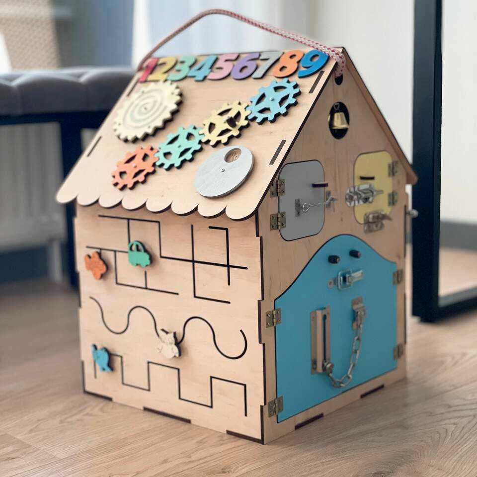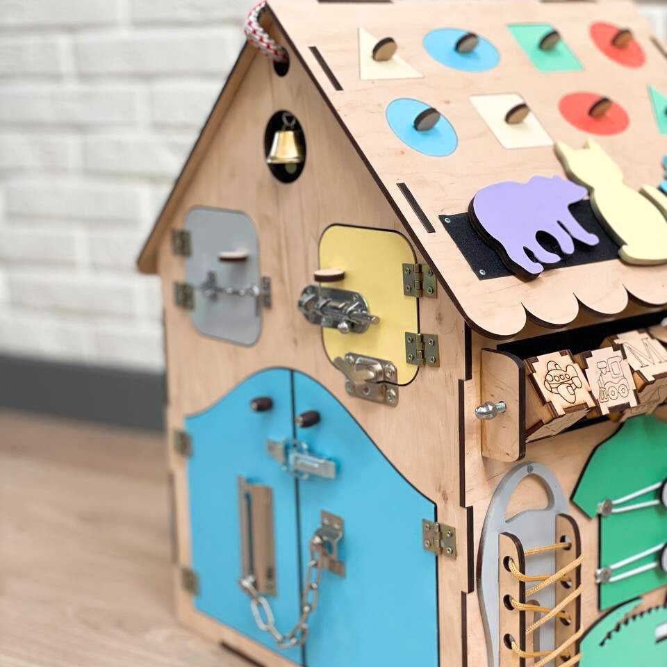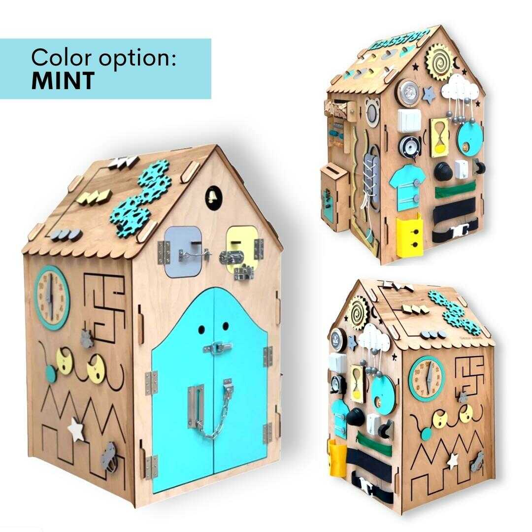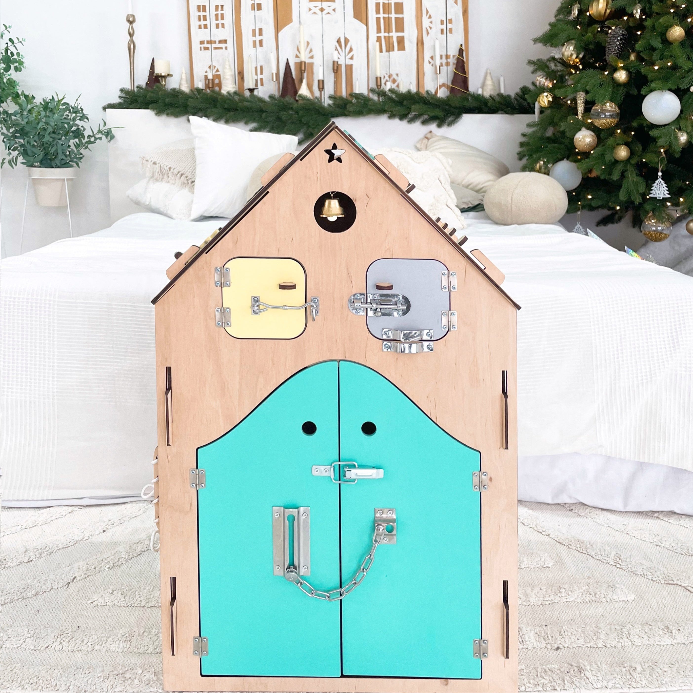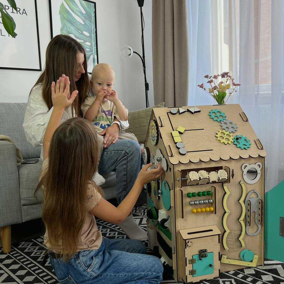 The busy house is designed to strengthen children's fine motor development. Children can play together with this toy, learning to collaborate in the process.