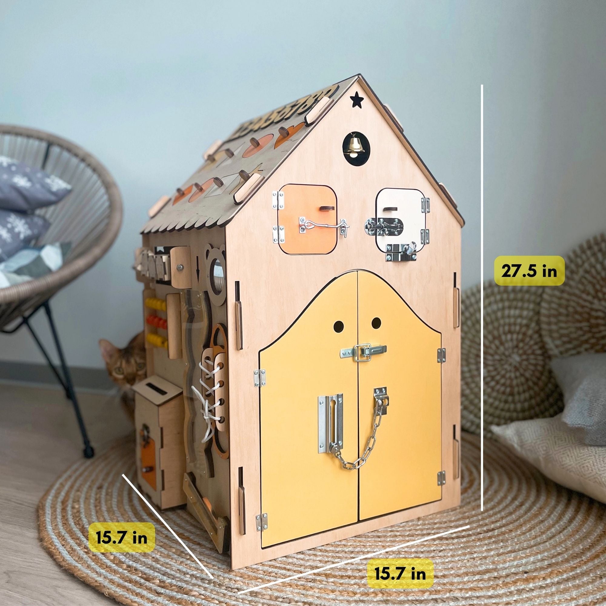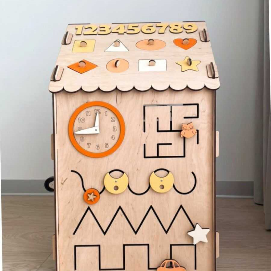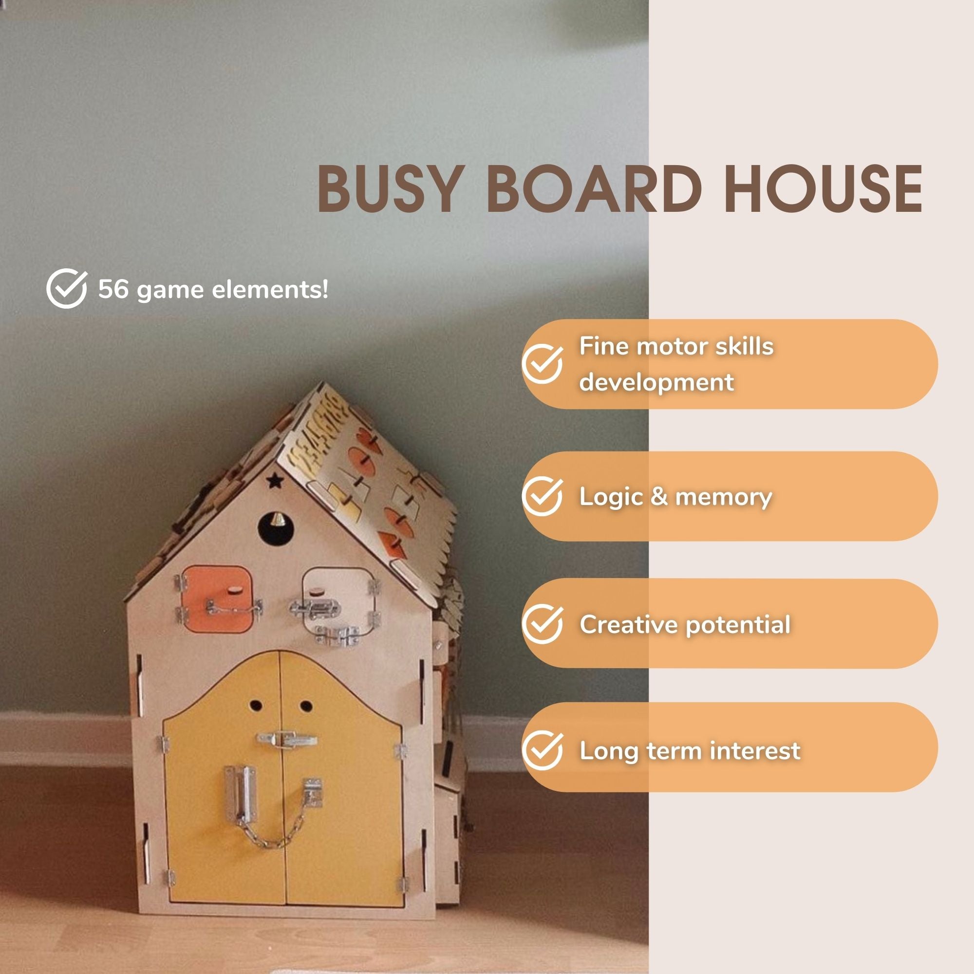 A busy board house is an educational product that multiple children can play with together. It has walls filled with various activities and an interior section where children can partially enter. Since it is made of durable material, it can be easily transported anywhere.
