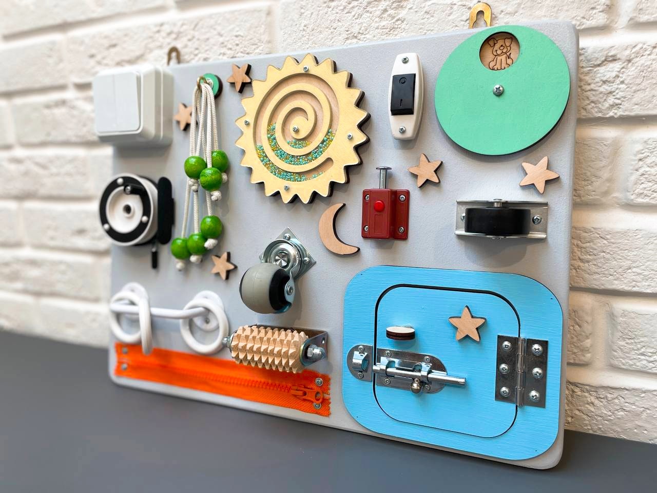 Busy board is educational toy for kids (from 1 to 3 years) made according to Montessori approach which develops: