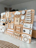 Busy board includes elements designed for different ages of child development. Some elements will be easy for one-year-olds while others aredesigned for children ages two and up. Thus, the toy “grows” with your child, since he/she always discovers something new!