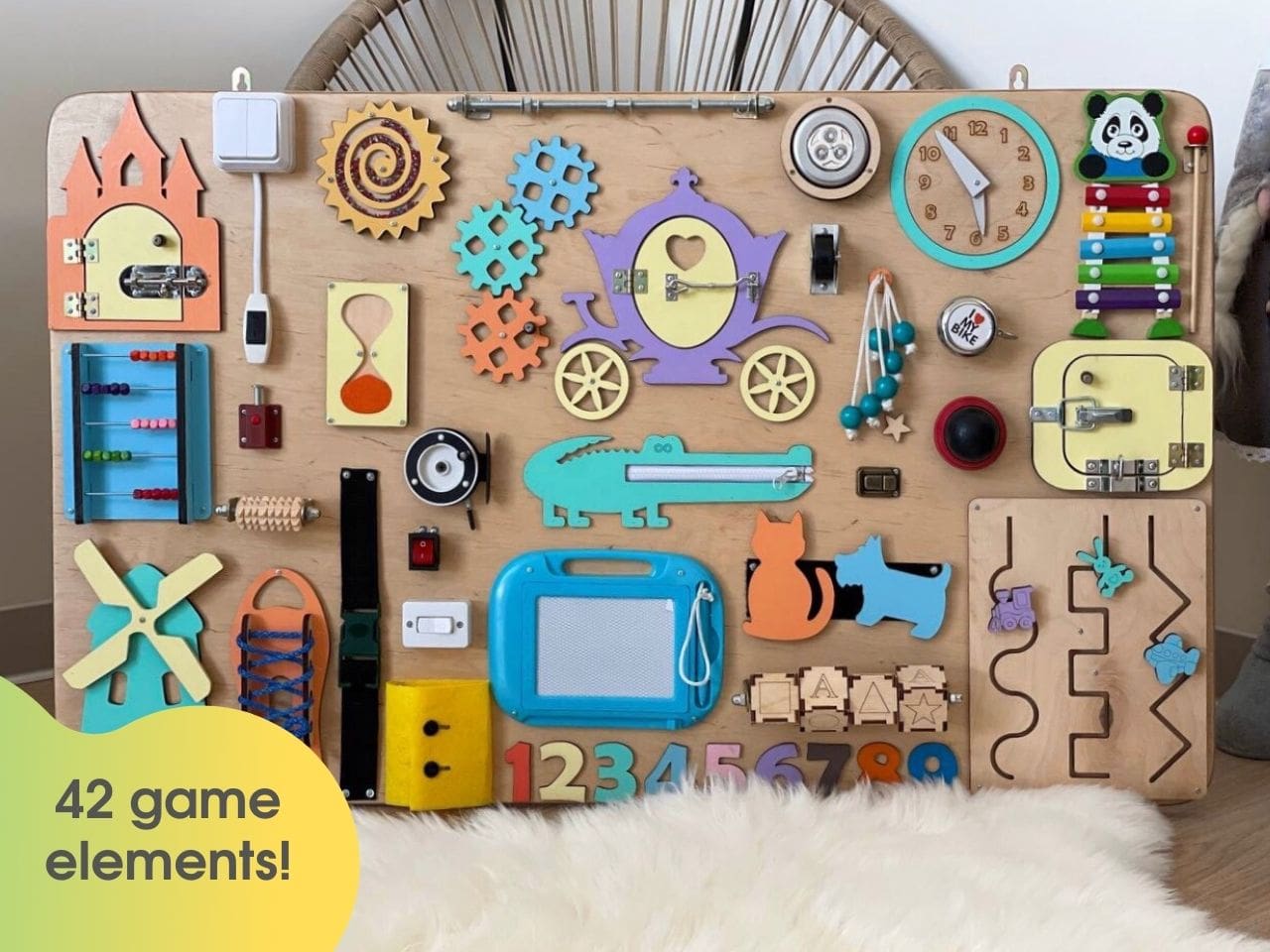 Busy board includes elements designed for different ages of child development. Some elements will be easy for one-year-olds while others aredesigned for children ages two and up. Thus, the toy “grows” with your child, since he/she always discovers something new!