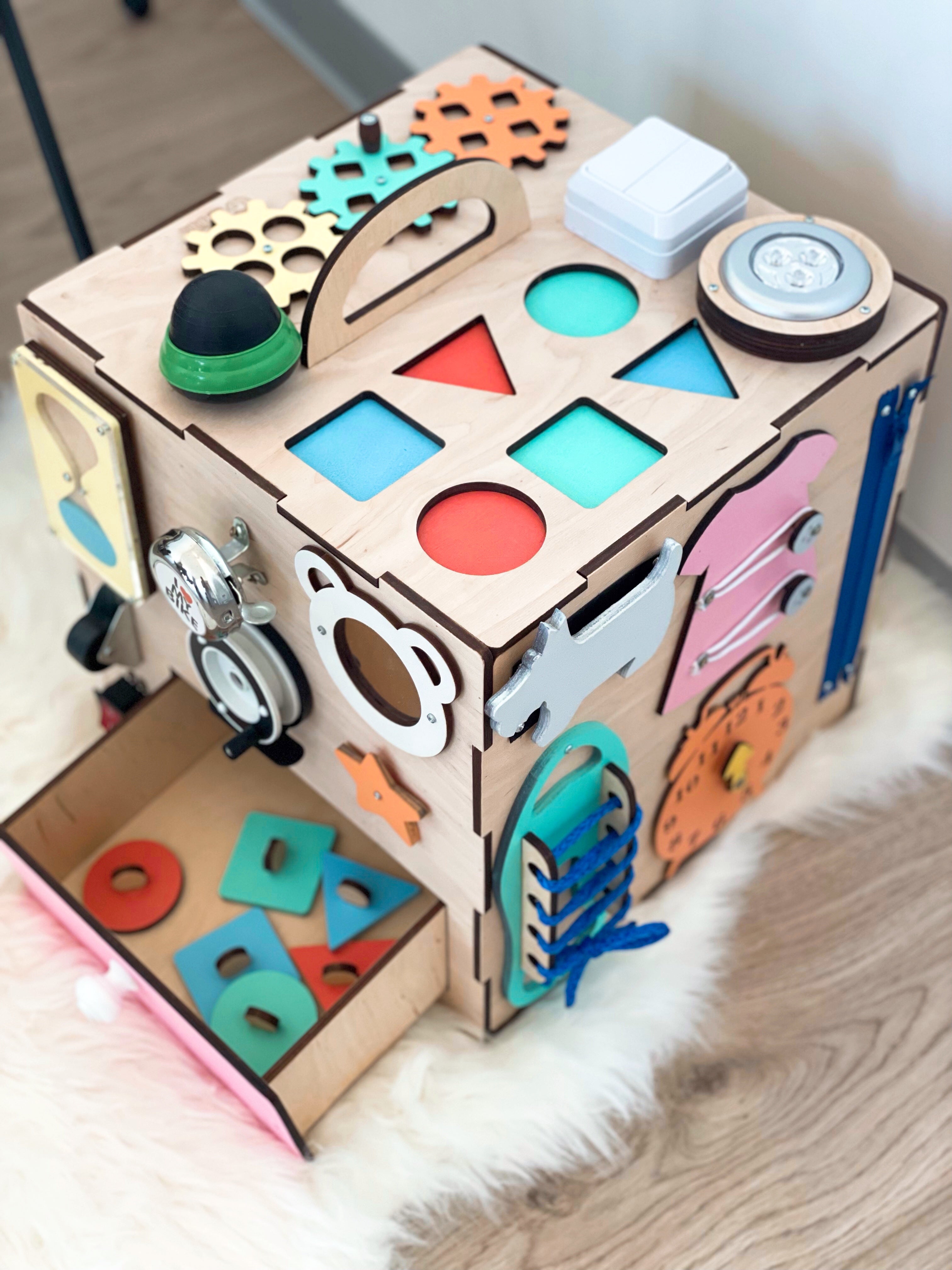 Busy cube is a training complex made of 5 different busy boards which will let your children easily develop their skills and creativity!