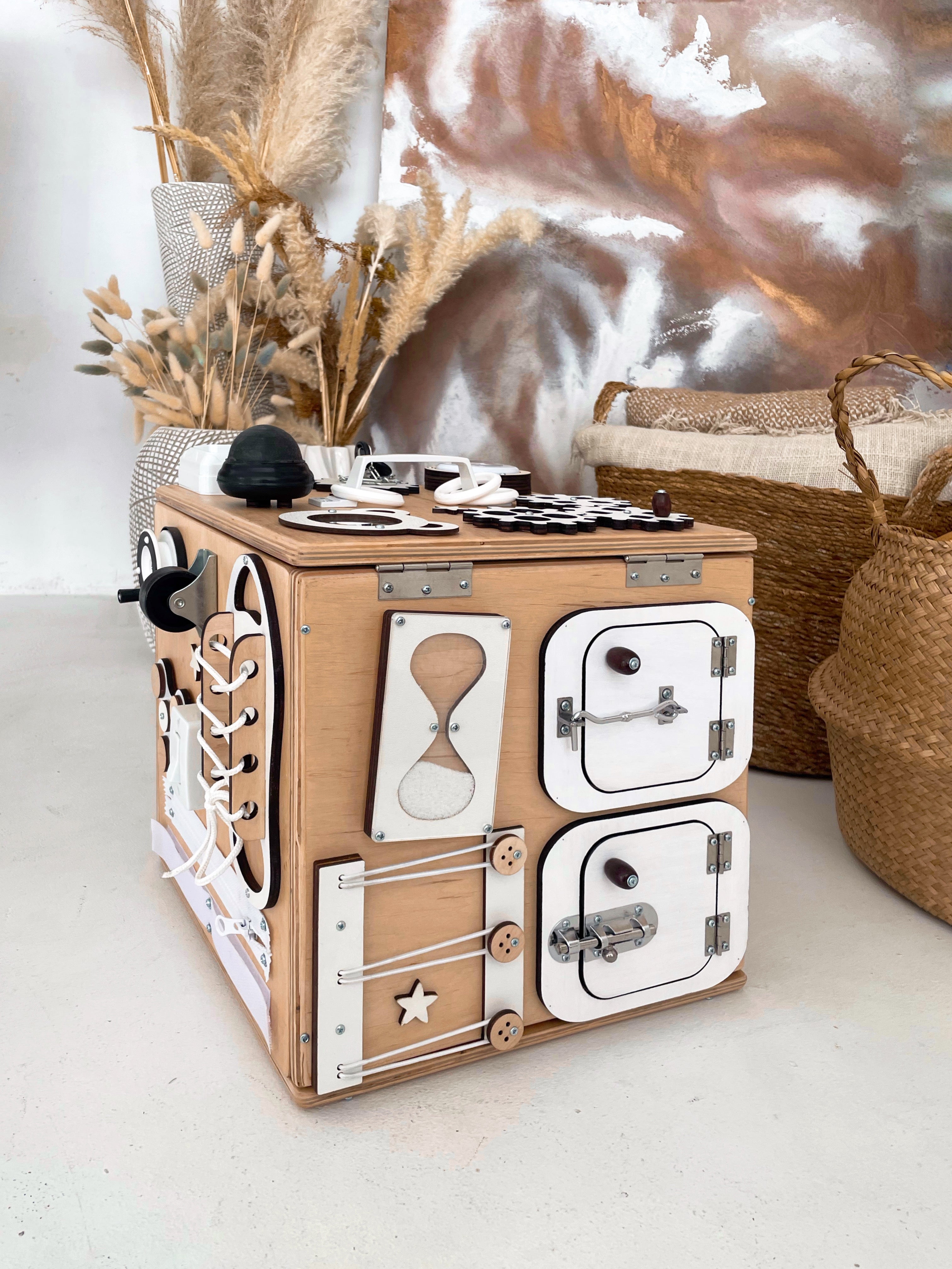 Busy board cube made according to Montessori approach  consists of 5 different busy boards and allows your children to easily develop their skills and creativity!